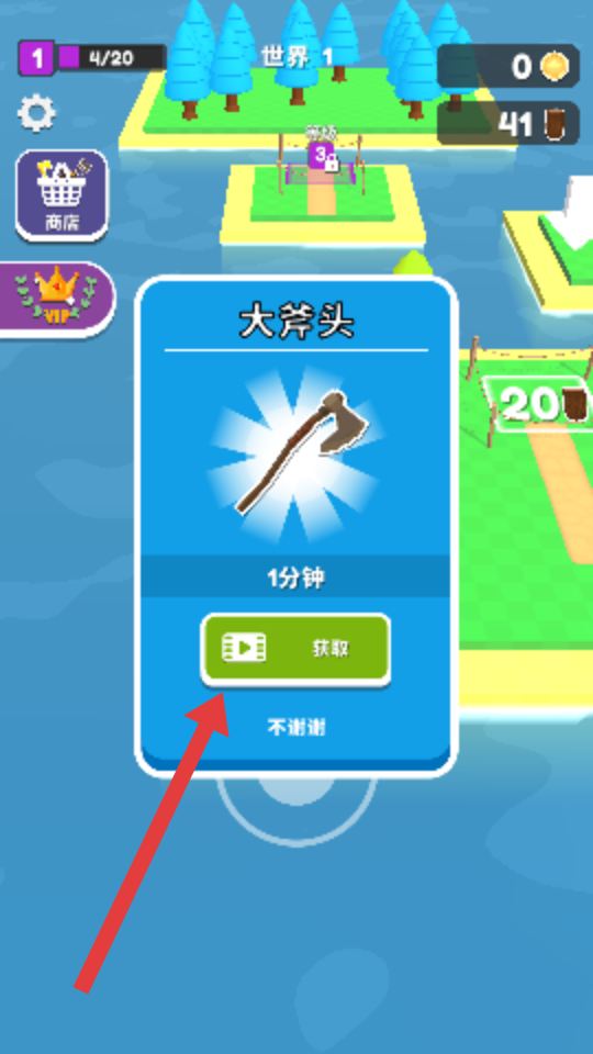 2、界面會彈出大斧頭獲取窗口,若想使用大斧頭,可點擊獲取按鈕,通過觀看視頻來獲得,助力更高效伐木。
