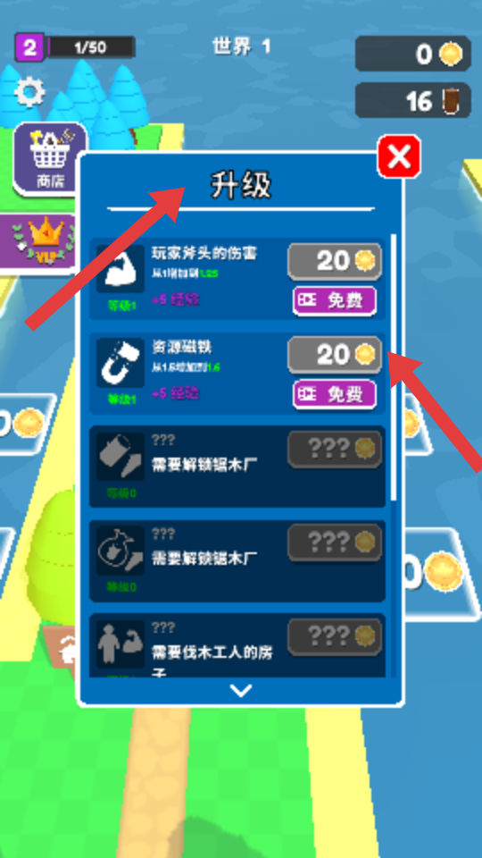4、當滿足一定條件后,會出現升級界面,可花費金幣升級玩家斧頭的傷害和資源磁鐵等,提升伐木效率與能力。