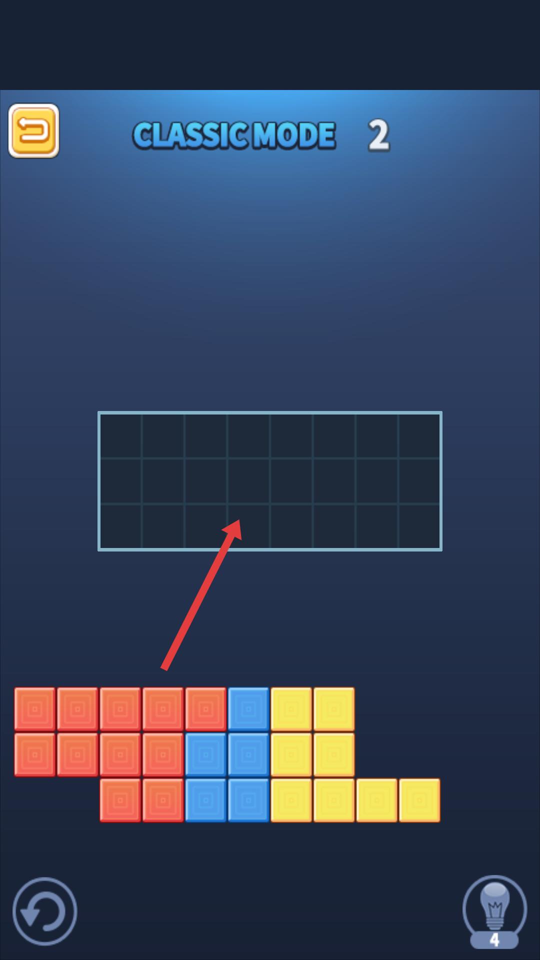 3、需將下方不同顏色和形狀的方塊,拖拽到上方的空白網格區域,合理擺放,盡量填滿行或列,以消除方塊得分。