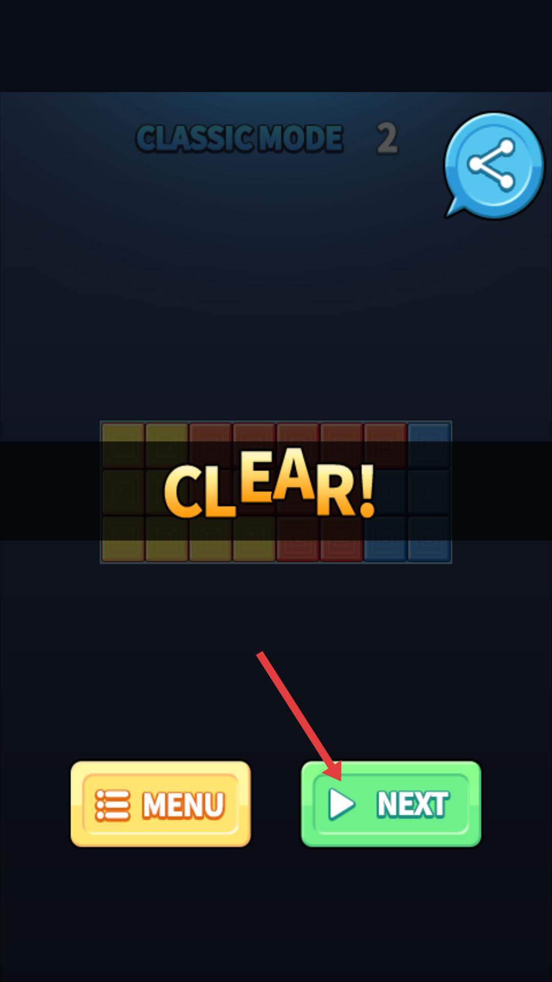 4、成功通關后界面會顯示CLEAR,此時點擊綠色的NEXT按鈕,可進入下一關,繼續挑戰更難的方塊拼圖任務。