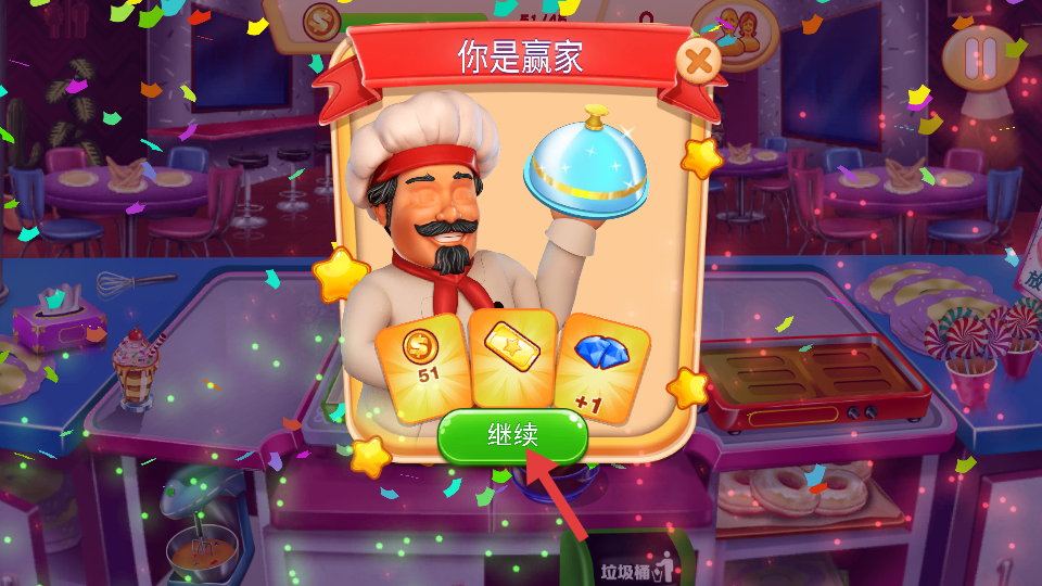 4、成功完成關卡后,會彈出你是贏家的提示,獲得金幣、金條、鉆石等獎勵,點擊繼續按鈕可進入下一個環節或關卡。