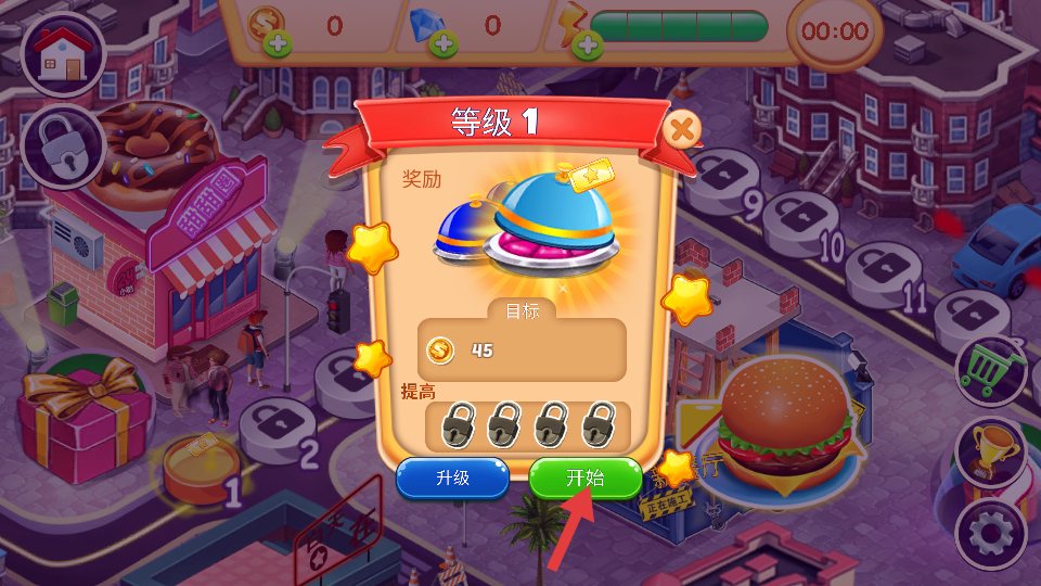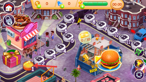 1、玩家進入游戲主界面,能看到甜甜圈店和待解鎖的關卡,點擊標有1的關卡,即可進入該關卡的準備界面。