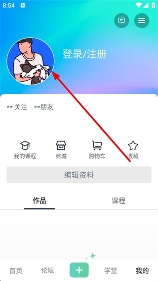 2、我的界面能看到登錄注冊入口,還有我的課程商城購物車收藏等功能選項,可點擊頭像區域進入登錄流程。