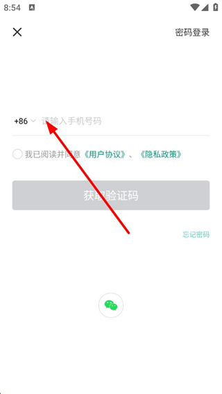 3、進入登錄界面后,選擇對應登錄方式,先輸入框填寫手機號碼,勾選同意相關協議后,可點擊獲取驗證碼按鈕。