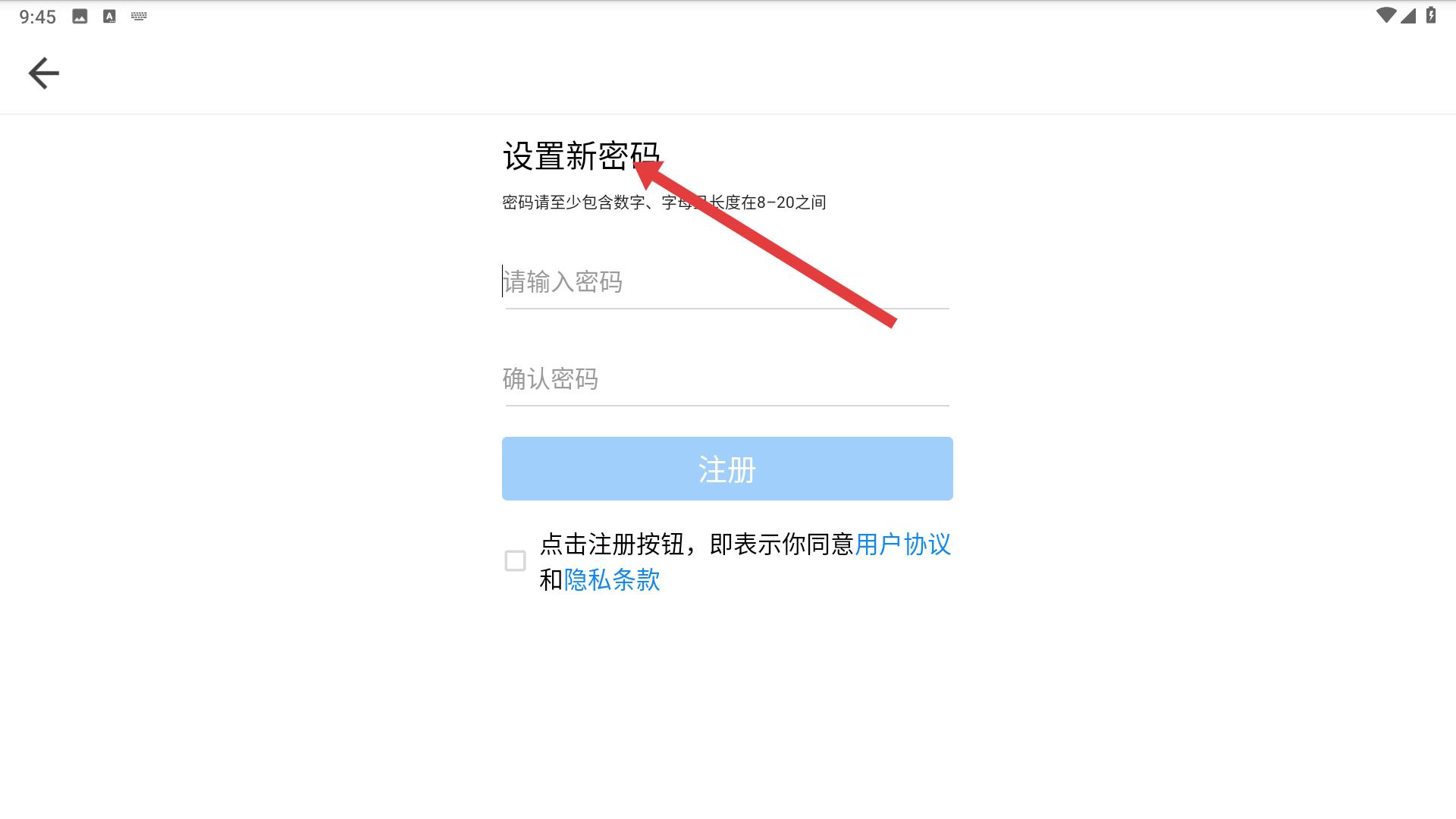 3、若需注冊新賬號,設置新密碼界面輸入符合要求的密碼并確認,勾選用戶協議和隱私條款后點擊注冊,可完成賬號注冊。
