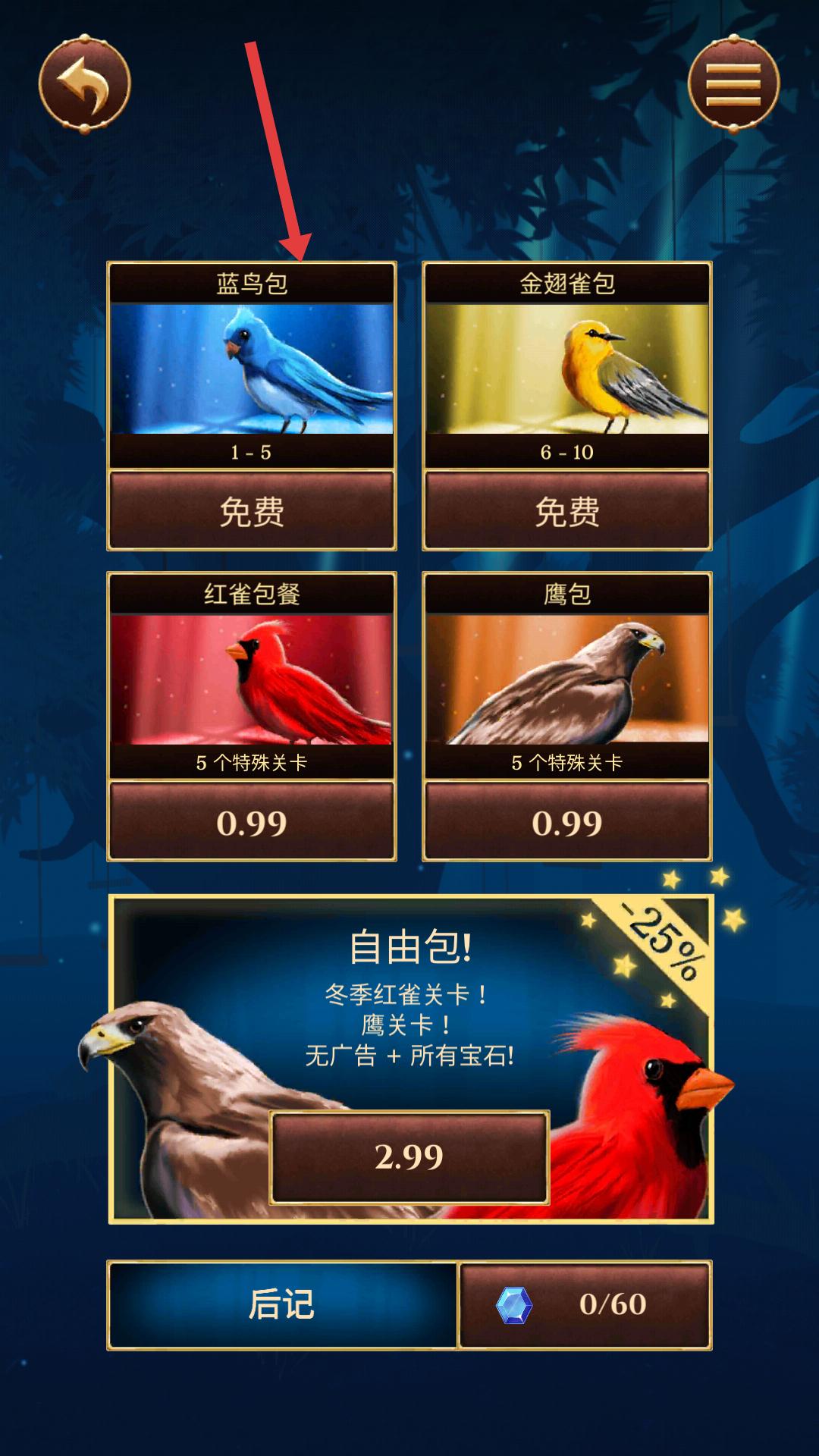 2、進入關卡選擇界面,可選擇藍鳥包等不同關卡包,藍鳥包包含5關且免費,適合新手先從這里開始挑戰。