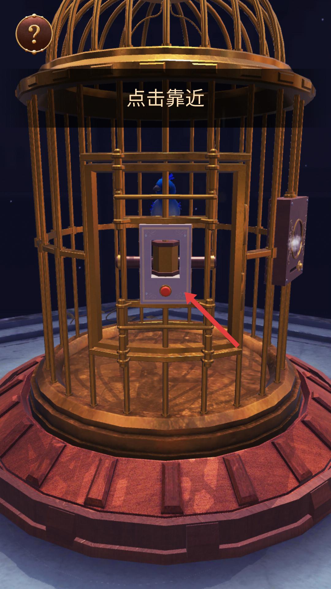 4、靠近鳥籠的機關后,看到紅色按鈕,按照提示按下按鈕,觸發機關,推進鳥籠解謎的進程,嘗試打開鳥籠。