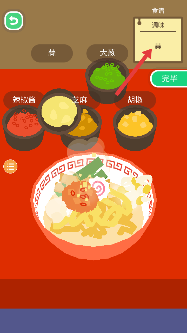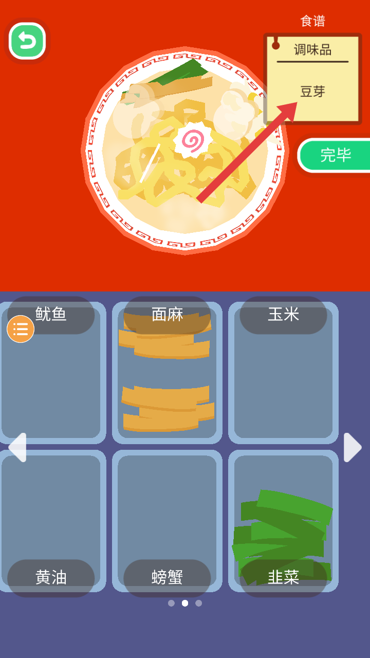 1、進入游戲,先根據食譜提示,選擇豆芽等食材添加到拉面中,進行基礎配料的準備。
