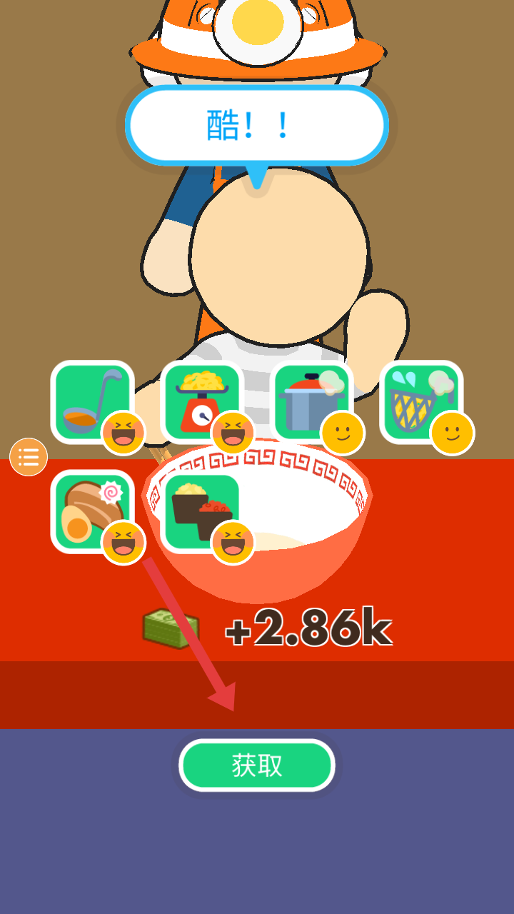 4、客人用餐滿意后,會給出中肯的評價,此時可點擊獲取按鈕,獲得金錢等獎勵,用于后續的拉面制作和店鋪經營。